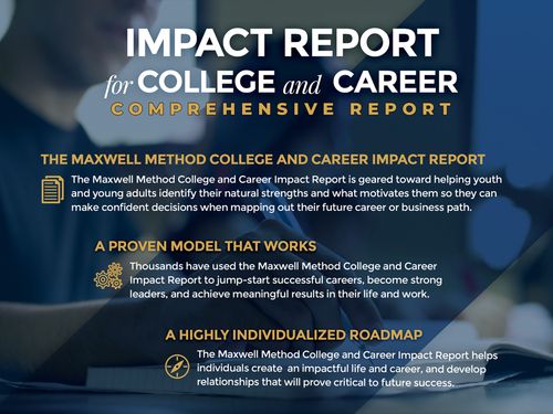 Making an impact means leaving your mark on the world in which you live. To do this, you must know who you are, how to communicate effectively with others, and how to use your strength to find the career path that's right for you. The Maxwell Method College and Career Impact Report provides a customized roadmap for your to discover you:
